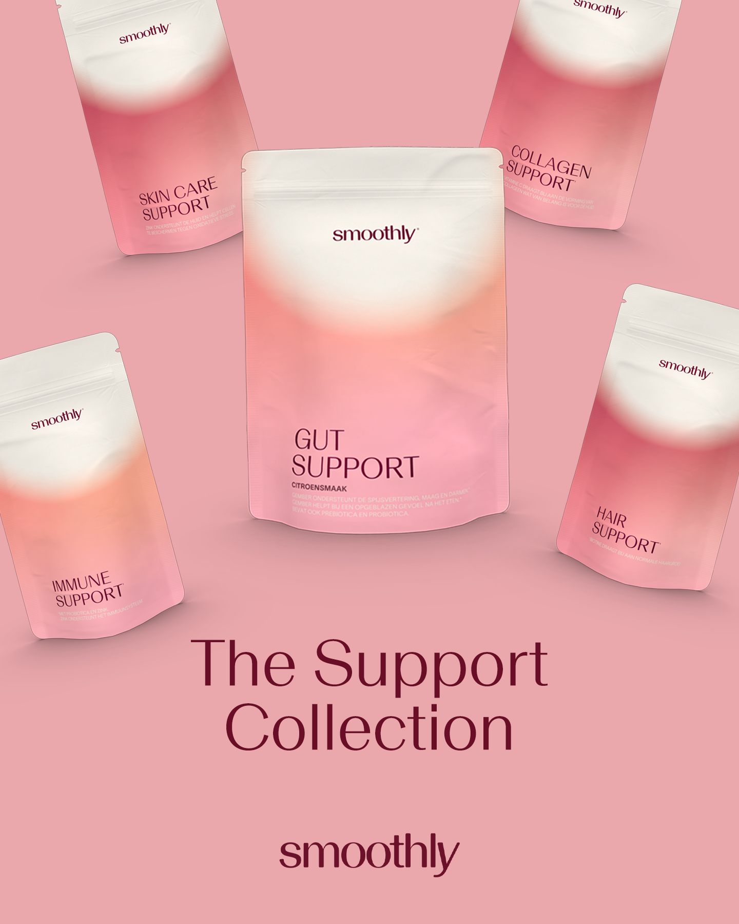 Skin Care Support ondersteunt de huid van binnenuit als aanvulling op de dagelijkse skincare routine. Gut Support richt zich op de darmen, een belangrijke basis voor hoe je je voelt. Vanaf het begin draait Smoothly om balans en beauty van binnenuit.